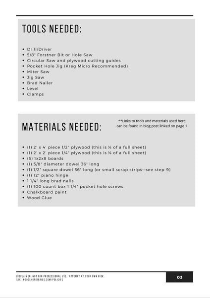 Tools & materials lists and overall dimensions can be found in the plan preview images and in the blog post linked above.